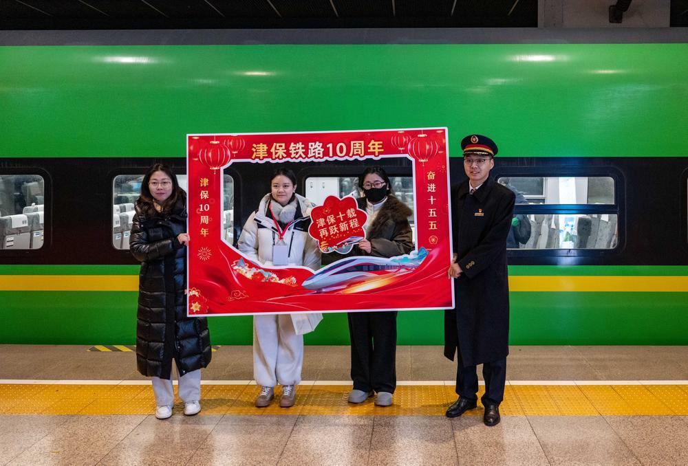 (베이징=신화통신) 톈진(天津)과 허베이(河北)성 바오딩(保定)을 잇는 진바오(津保) 철도가 개통 10주년을 맞았다. 징진지(京津冀, 베이징∙톈진∙허베이) 교통 일체화의 중요한 고속철도 통로 역할을 하고 있는 진바오 철도는 지난 11월 30일 기준 누적 여객 운송량 9천807만3천 명(연인원)을 기록했다. 27일 진바오 철도 개통 10주년을 축하하며 승객과 승무원이 플랫폼에서 기념촬영을 하고 있다. 2025.12.27