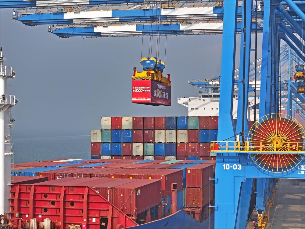 (중국 친저우=신화통신) 광시(廣西) 베이부완(北部灣)항에서 배에 실리는 1천만 번째 컨테이너를 30일 드론으로 내려다봤다. 이날 올해 1천만 번째 컨테이너가 '신팡청(新防城)호'에 선적되면서 베이부완항이 1천만TEU급 대형 항구 대열에 진입했다. 2017년부터 지금까지 베이부완항의 컨테이너 처리량은 연평균 20% 이상의 성장을 이뤘다. 2025.12.30 Copyright © 이코노믹데일리, 무단전재·재배포 금지 좋아요0 화나요0 추천해요0