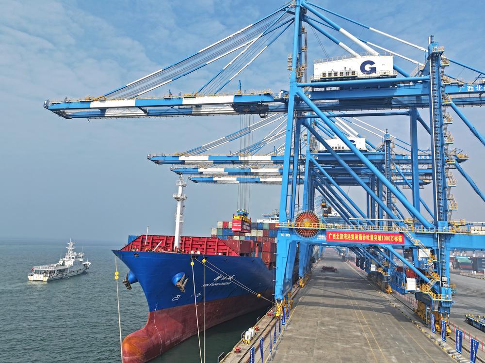 (중국 친저우=신화통신) 30일 올해 1천만 번째 컨테이너가 '신팡청(新防城)호'에 선적되면서 광시(廣西) 베이부완(北部灣)항이 1천만TEU급 대형 항구 대열에 진입했다. 2017년부터 지금까지 베이부완항의 컨테이너 처리량은 연평균 20% 이상의 성장을 이뤘다. 베이부완항에서 1천만 번째 컨테이너가 적재되는 모습을 이날 드론 사진에 담았다. 2025.12.30 Copyright © 이코노믹데일리, 무단전재·재배포 금지 좋아요0 화나요0 추천해요0
