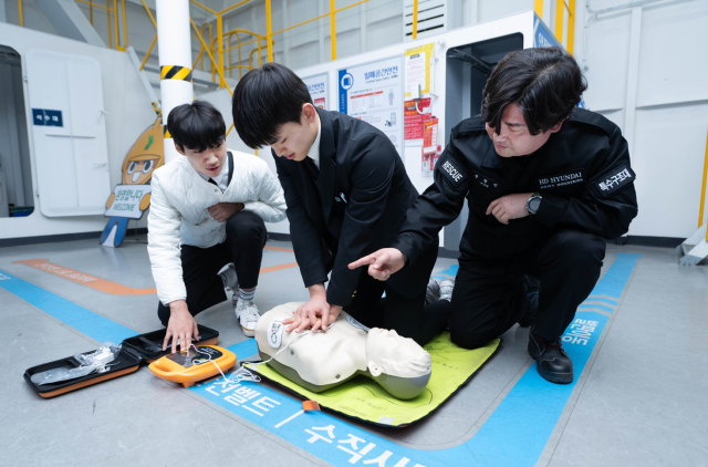 HD현대중공업은 지난 6일 회사 직원 자녀인 윤재준 군(대송고 2학년)과 친구 문현서 군(화암고 2학년)을 울산 조선소로 초청해 대표이사 표창과 장학금을 전달했다고 7일 밝혔다. 두 학생은 지난달 식당에서 의식을 잃고 쓰러진 80대 노인을 발견하고 침착하게 심폐소생술(CPR)을 실시해 생명을 구한 공로를 인정받았다.