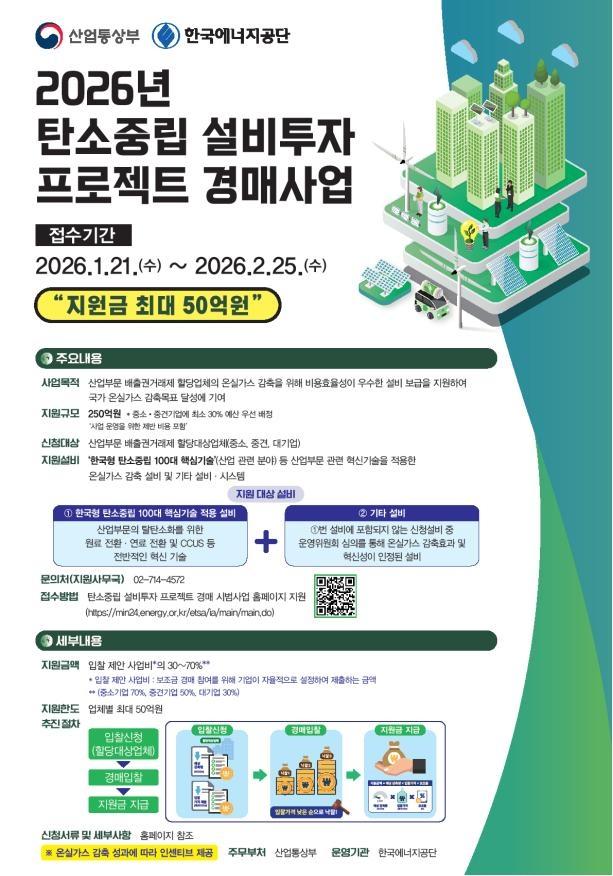 이번 사업은 동일한 예산으로 최대한의 탄소 감축 효과를 내기 위해 정부 지원 방식을 기존 일률적 보조금 지급에서 경쟁형 경매 방식으로 전환한 것이 특징이다. 기업들이 스스로 가장 효율적인 감축 방안을 제시하도록 유도해 정책 효율성을 높이겠다는 취지다.