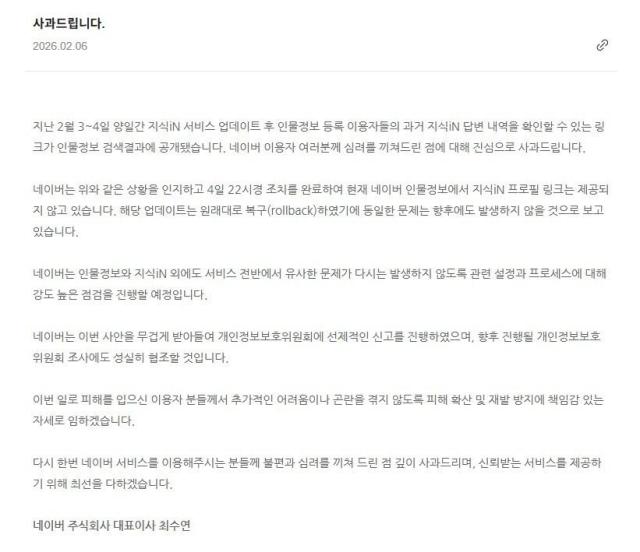 네이버(대표 최수연)는 지난 6일 최 대표 명의의 공지문을 통해 "지난 3일부터 4일 사이 지식인 서비스 업데이트 과정에서 인물정보 검색 결과에 과거 답변 내역을 확인할 수 있는 링크가 노출되는 오류가 있었다"며 "이용자 여러분께 심려를 끼쳐드린 점에 대해 진심으로 사과드린다"고 밝혔다.